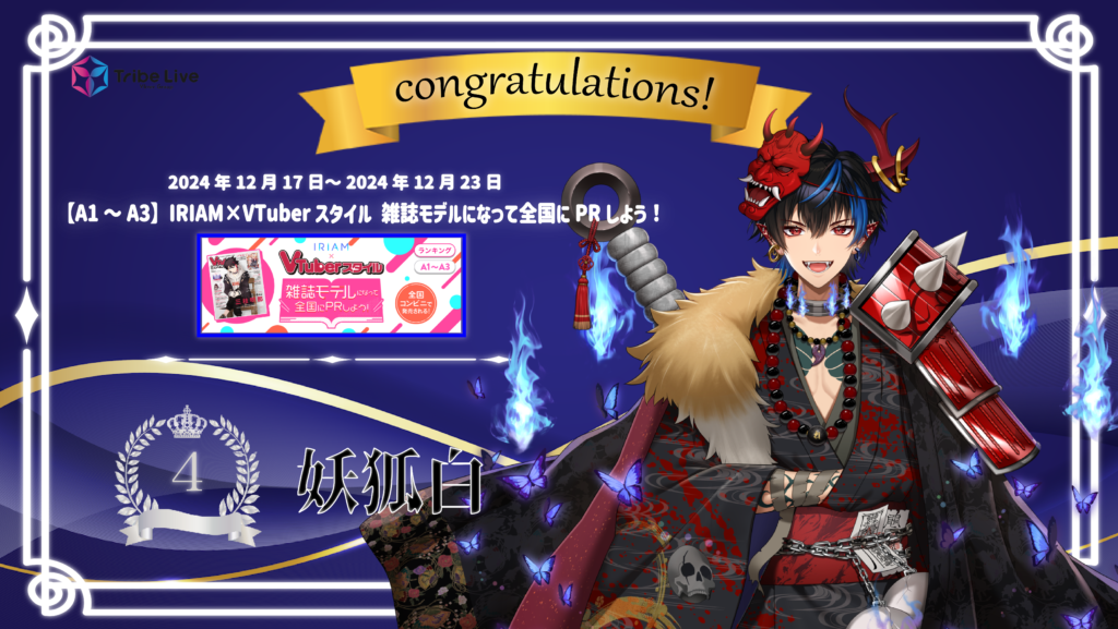 12/17~12/23開催の【A1~A3】IRIAM×VTuberスタイル 雑誌モデルになって全国にPRしよう!にて、 妖狐白さん(@genkai0918)が4位に入賞致しました。 おめでとうございます! 応援してくださった皆様、ありがとうございました。