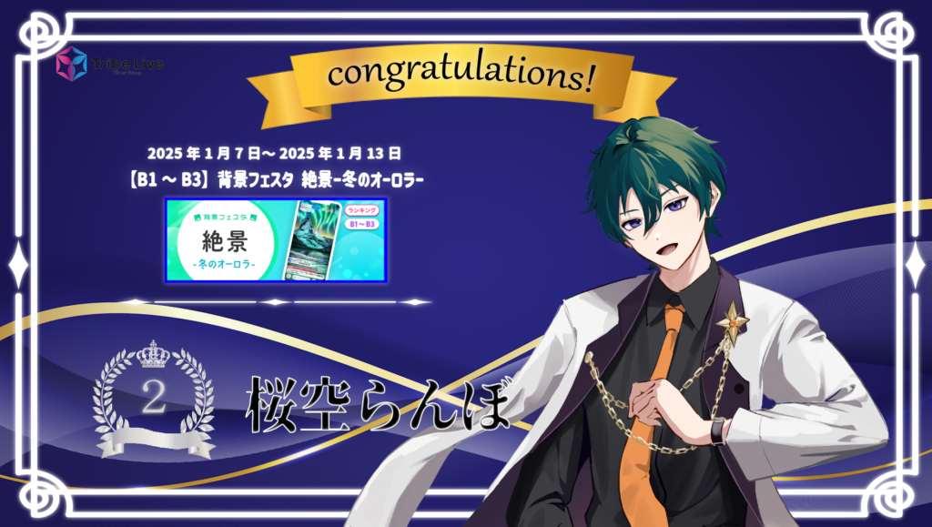 1/7~1/13開催の【B1~B3】背景フェスタ 絶景ー冬のオーロラーにて、 桜空らんぼさん(@cerry_blo28)が2位に入賞致しました。 おめでとうございます! 応援して下さった皆様、ありがとうございました。 -