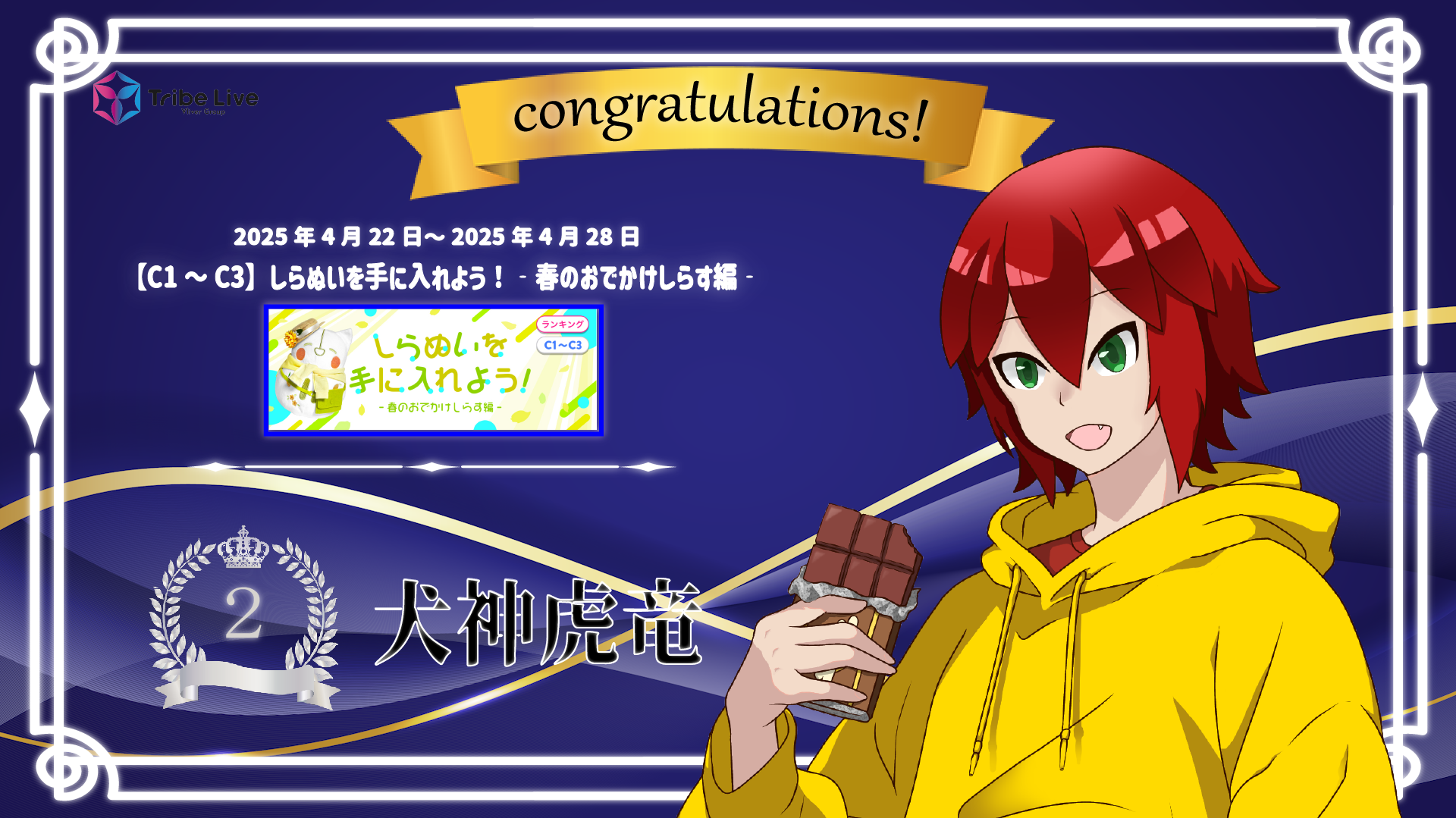【入賞報告】 2025 5/15 2025年5月15日 4/22~4/28開催の【C1~C3】しらぬいを手に入れよう!‐春のおでかけしらす編‐にて、 犬神虎竜さん(@Inugami_Kotatu)が2位に入賞致しました。 おめでとうございます! 応援して下さった皆様、ありがとうございました。 未分類 よかったらシェアしてね! URLをコピーしました! URLをコピーしました! 【入賞報告】 【入賞報告】 関連記事 お知らせ 2023年2月7日 【入賞報告】 2024年5月17日 【入賞報告】 2024年5月27日 【入賞報告】 2024年5月27日 【入賞報告】 2024年5月31日 【入賞報告】 2024年6月12日 【入賞報告】 2024年7月29日 【入賞報告】 2024年8月4日