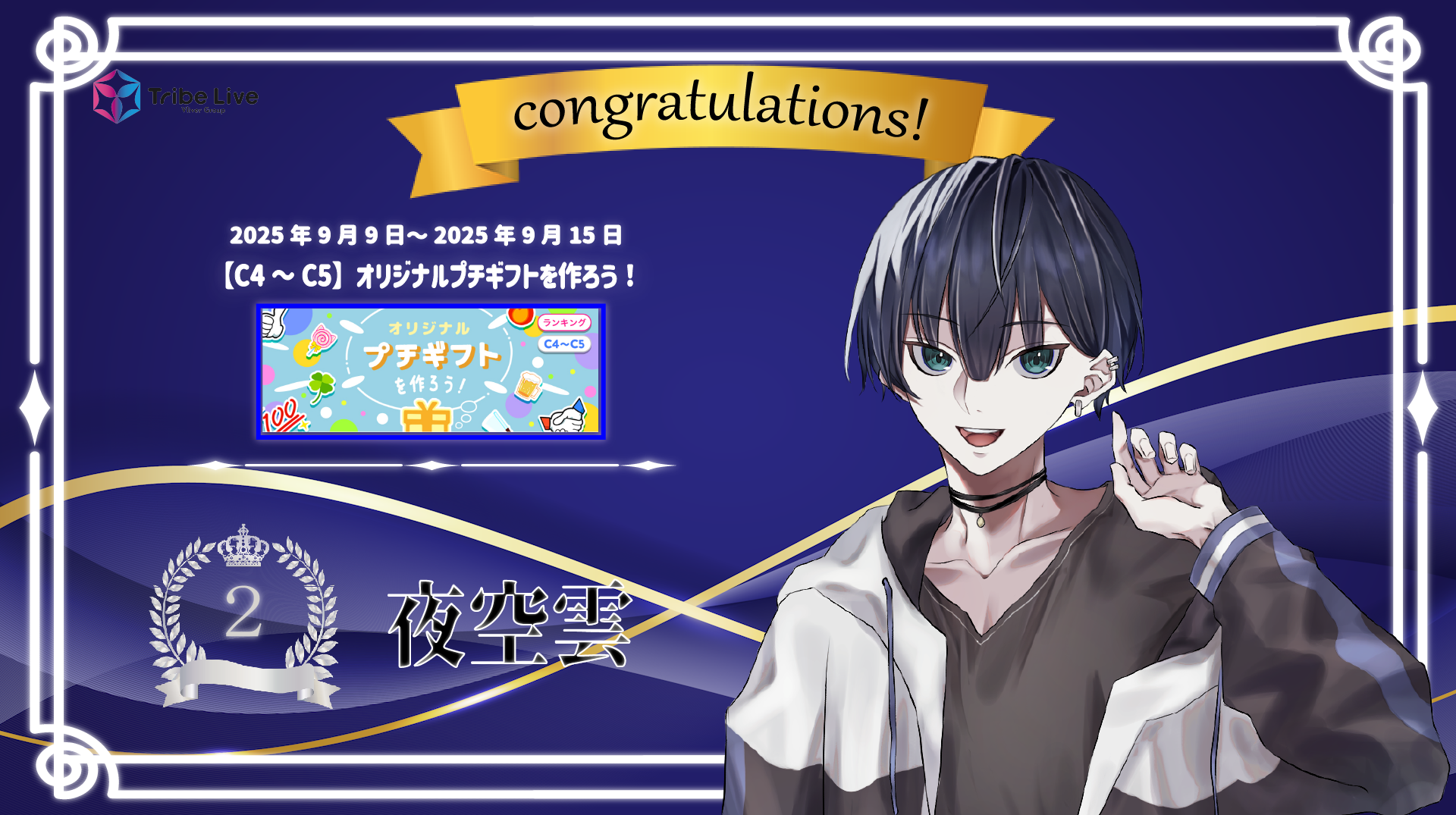 【入賞報告】 2025 11/23 2025年11月23日 9/9~9/15開催の【C4~C5】オリジナルプチギフトを作ろう!にて、 夜空雲さん(@kumo_yozora)が2位に入賞致しました。 おめでとうございます! 応援して下さったリスナーの皆様、ありがとうございました。 未分類 よかったらシェアしてね! URLをコピーしました! URLをコピーしました! 【入賞報告】 【入賞報告】 関連記事 お知らせ 2023年2月7日 【入賞報告】 2024年5月17日 【入賞報告】 2024年5月27日 【入賞報告】 2024年5月27日 【入賞報告】 2024年5月31日 【入賞報告】 2024年6月12日 【入賞報告】 2024年7月29日 【入賞報告】 2024年8月4日