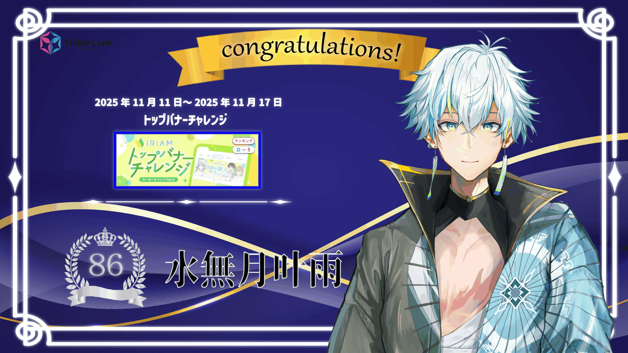 【入賞報告】 2025 11/23 2025年11月23日 11/11~11/17開催のトップバナーチャレンジにて、 水無月叶雨さん(@minadukikaname)が86位に入賞致しました。 おめでとうございます.ᐟ.ᐟ 応援して下さったリスナーの皆様、ありがとうございました。 未分類 よかったらシェアしてね! URLをコピーしました! URLをコピーしました! 【入賞報告】 【入賞報告】 関連記事 お知らせ 2023年2月7日 【入賞報告】 2024年5月17日 【入賞報告】 2024年5月27日 【入賞報告】 2024年5月27日 【入賞報告】 2024年5月31日 【入賞報告】 2024年6月12日 【入賞報告】 2024年7月29日 【入賞報告】 2024年8月4日