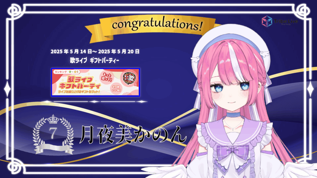 5/14~5/20開催の歌ライブギフトパーティー(topia)にて、 月夜美かのんさん(@Kanon_x_x_x_)が7位に入賞致しました。 おめでとうございます! 応援してくださった皆様、ありがとうございました。