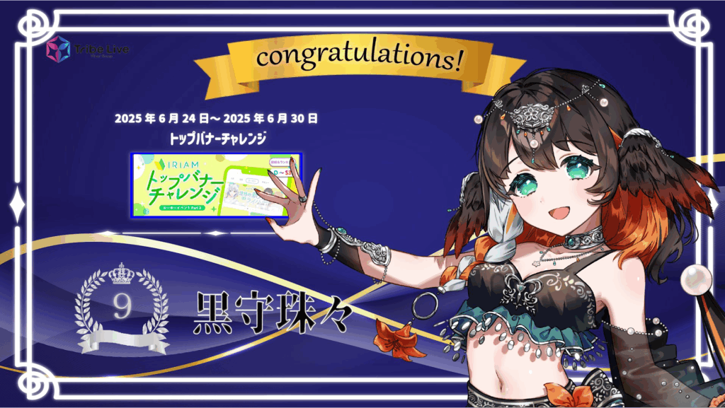6/24~6/30開催のトップバナーチャレンジにて、 黒守珠々さん(@kuromori1010)が9位に入賞致しました。 おめでとうございます! 応援して下さった皆様、ありがとうございます。 -