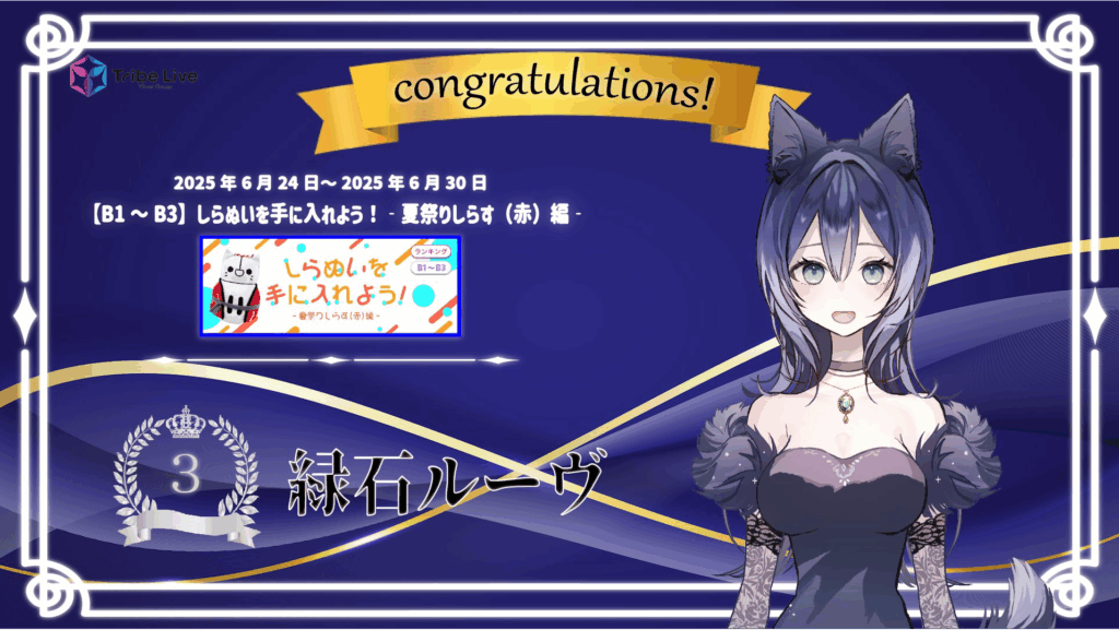 6/24~6/30開催の【B1~B3】しらぬいを手に入れよう!‐夏祭りしらす(赤)編‐にて、 緑石ルーヴさん(@Ryokuseki_Louve)が3位に入賞致しました。 おめでとうございます! 応援して下さった皆様、ありがとうございます。 -