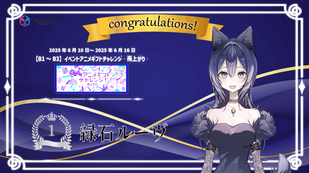 /10~6/16開催の【B1~B3】イベントアニメギフトチャレンジ!‐雨上がり‐にて、 緑石ルーヴさん(@Ryokuseki_Louve)が1位に入賞致しました。 おめでとうございます! 応援して下さった皆様、ありがとうございました。 -