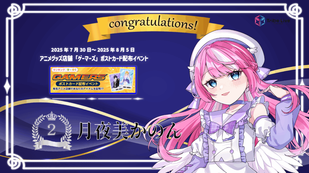 7/30~8/5開催のアニメグッズ店舗「ゲーマーズ」ポストカード配布イベント(topia)にて、 月夜美かのんさん(@Kanon_x_x_x_)が2位に入賞致しました。 おめでとうございます.ᐟ.ᐟ 応援して下さったリスナーの皆様、ありがとうございました。 -